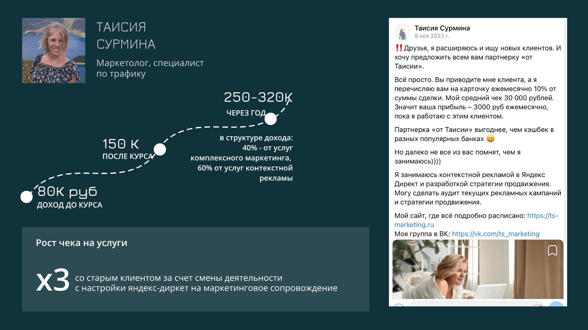 Это Таисия Сурмина, маркетолог и специалист по трафику.